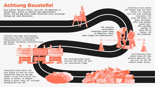 „Eigentlich müssen Entwickler:innen dazu nur eine Liste aller erlaubten Quellen anlegen.“ Das hört sich simpel an, ist es aber in der Praxis nicht, wie Roths und Gröbers Studie zeigt. Alleine das Zusammentragen der verschiedenen Quellen, aus denen Code geladen werden soll, sei in den Unternehmen oft komplizierter als gedacht, weil für das Design und den Inhalt der Seiten unterschiedliche Entwickler:innen-Teams zuständig sind und ein reibungsloser Ablauf nur dann gewährleistet ist, wenn alle wichtigen Informationen an einer Stelle zusammenlaufen. Zudem binden Drittanbieter:innen oft in ihren Code den Code weiterer Webseiten ein, die ebenfalls in die Liste mitaufgenommen werden müssen, damit alles reibungslos klappt. Welche das sind ist laut Roth für Entwickler:innen oft gar nicht so klar ersichtlich.
